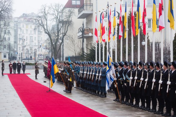 Солдат почесного караулу втратив головний убір під час салютування президентам біля АП. Після офіційної церемонії Порошенко підняв шапку і повернув її воїну почесної варти.