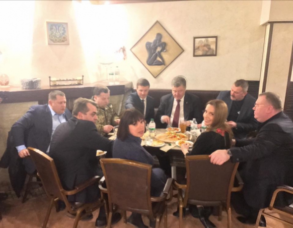 На світлині у компанії Порошенка - міністр оборони Степан Полторак, народні депутати Тетяна Ричкова і Юрій Береза, мер Борис Філатов.