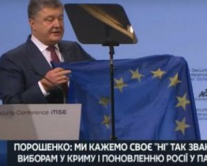 Президент Петро Порошенко під час виступу на Мюнхенській конференції з безпеки розгорнув прапор ЄС, прострелений на Донбасі.