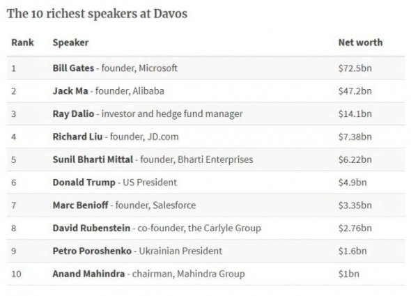 Американське видання також звернуло увагу, що найбагатшим учасником форуму є засновник Microsoft Білл Гейтс із $72 млрд статків. За ним - засновник китайського оптового гіганта Alibaba Джек Ма ($47,2 млрд). Тоді - і Рей Даліо, інвестор і менеджер хедж-фондів ($14,1 млрд).