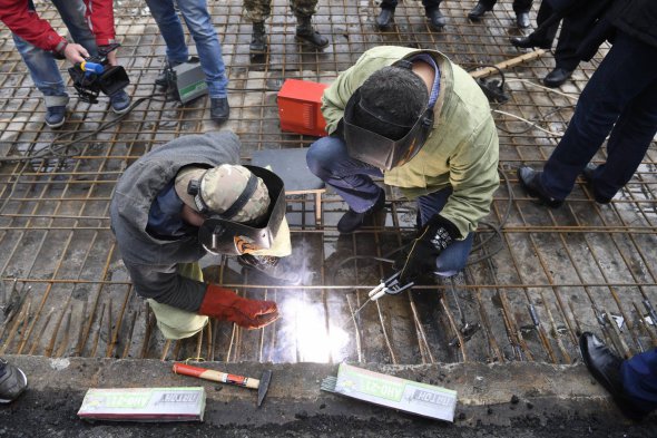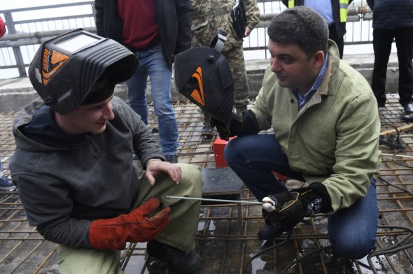 "Один із швів мостової конструкції зварив сам", - похизувався прем'єр у Facebook та виклав фото, де він у касці зварювальника.