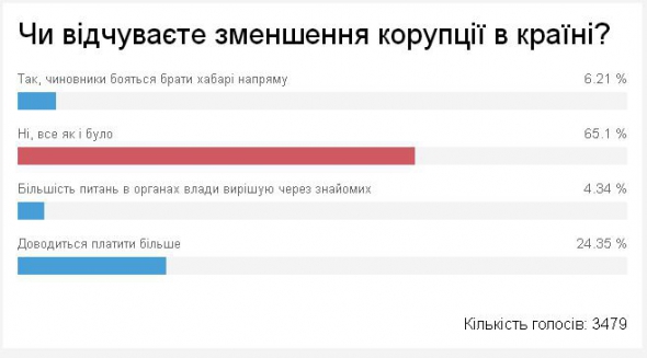 На запитання: "Чи відчуваєте зменшення корупції в країні?" 65,1 % користувачів відповіли: "Ні - все як і було".