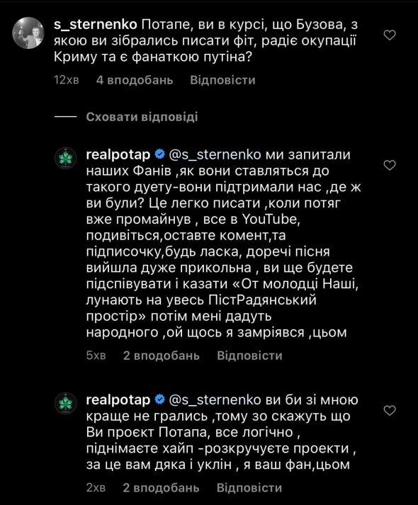 "Ні, Потап. Записувати спільну пісню із Бузовою, яка підтримує окупацію частини твоєї країни, це не "Kyiv Style". Це Москва, лапті і балалайка стайл.