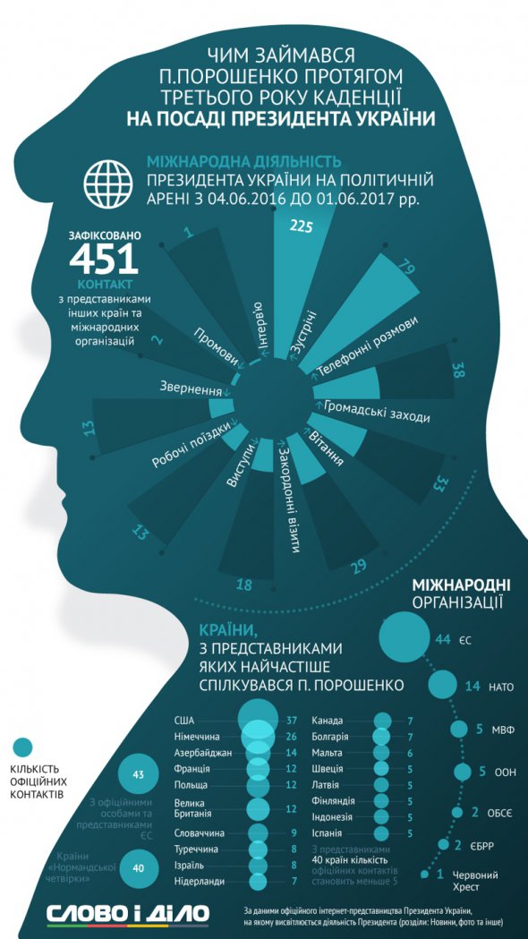 Міжнародна активність Порошенка в 2016-2017 роках зросла майже вдвічі: з 255 до 451 контакту з представниками інших країн і міжнародних організацій.