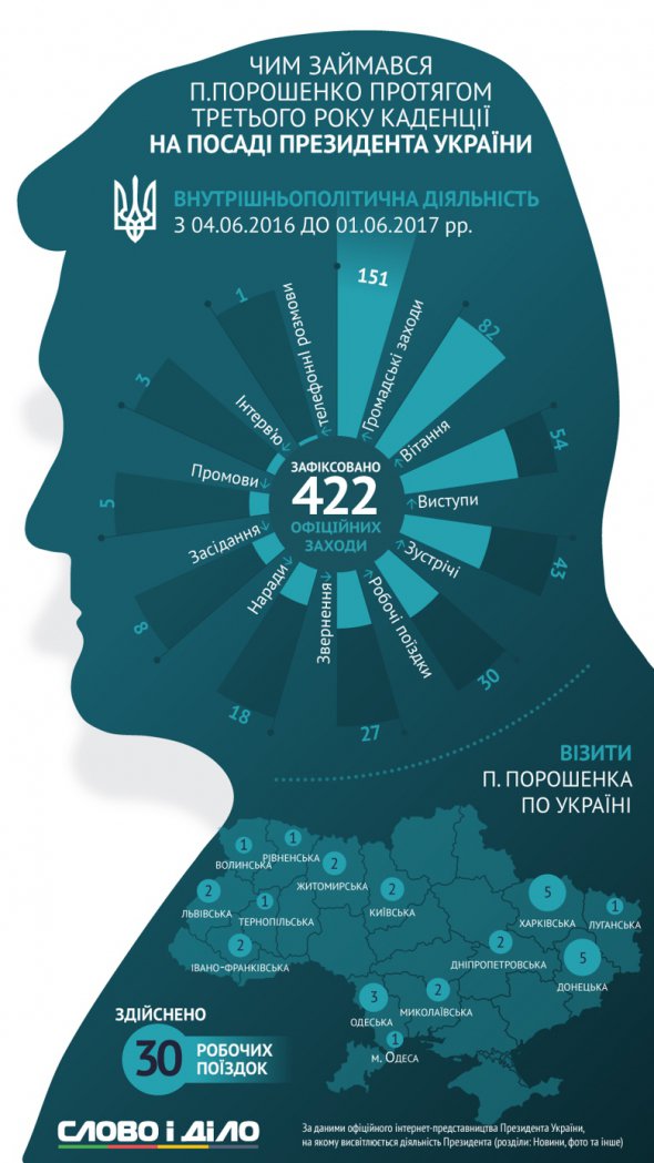 Порошенко 30 раз побував в областях країни – стільки ж, скільки протягом свого другого року. Найбільш відвідуваними стали Донецька та Харківська області, куди глава держави зробив по п'ять поїздок, а також Одеська - три візити.