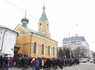 Починається дощ. Люди розходяться. Мирослава Ґонґадзе з доньками заходять до храму. Люди говорять, що приїде президент Петро Порошенко.