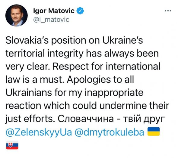 "Позиція Словаччини щодо територіальної цілісності України завжди була чіткою. Повага до міжнародного права є обов'язковою. Прошу вибачення в усіх українців за мою недоречну реакцію, яка може підірвати їхні справедливі зусилля", – заявив Матович.