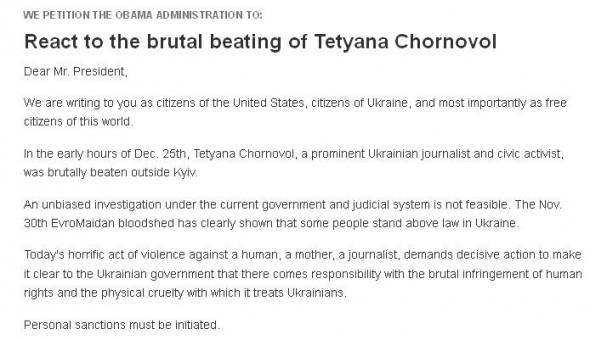 Майже 600 людей вимагають від влади США рішуче відреагувати на побиття відомої української журналістки Тетяни Чорновол.