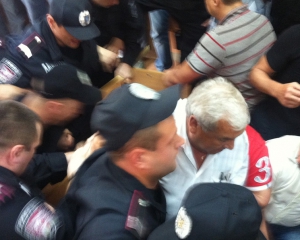 Біля арки, яка веде у дворик Печерського райсуду Києва, відбувається бійка між міліцією та прихильниками екс-прем'єра України, лідера партії "Батьківщина" Юлії Тимошенко.