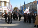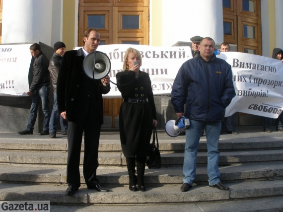 1 листопада о 13.00 біля Вінницької облдержадміністрації зібрались представники опозиції. Тримають у руках прапори "Батьківщини" та "Свободи". Розгорнули плакати "Вимагаємо чесних і прозорих виборів", "Ганьба фальсифікаторам!", "Домбровський, припини "безпрєдєл"!".