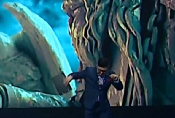 Під музику заставки програми Березовець танцював. За ним спостерігала інша телеведуча Марина Леончук.