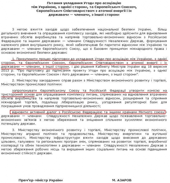 "Призупинити процес підготовки до укладення Угоди про асоціацію між Україною, з одного боку , та Європейським Союзом, Європейським Співтовариством з атомної енергії та їх державами - членами, з іншого боку, і дію рішення Кабінету міністрів України від 18 вересня 2013 р. "Про підготовку до підписання проекту Угоди про асоціацію між Україною, з одного боку, та Європейським Союзом і його державами-членами, з іншого боку", - йдеться в тексті розпорядження.