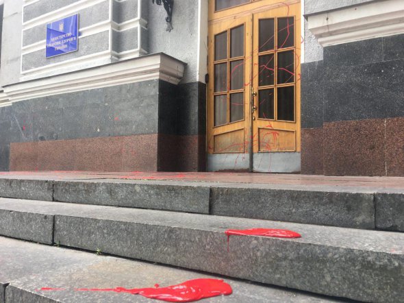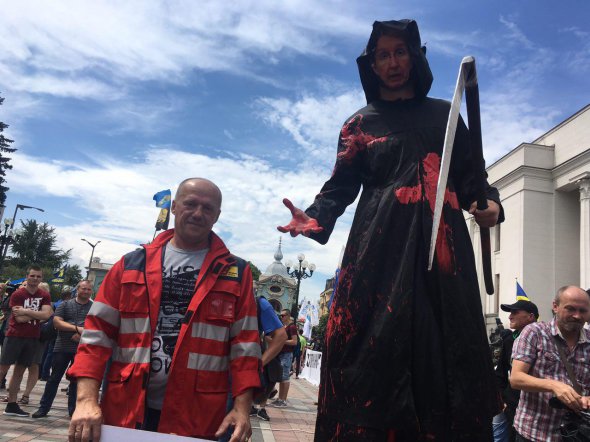 Протестувальники залили "кров'ю" будівлю Мінохорони здоров'я та доріжку, якою пройшла "Супрун" у вигляді смерті з косою. У такий спосіб понад 3,5 тисячі протестувальників з профспілок Волинця висловили протест проти медичної реформи "на крові", яку реалізує МОЗ.