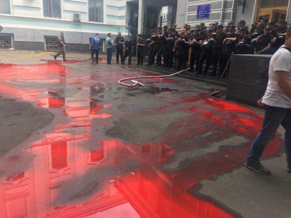 Будівлю МОЗ було залито "кров'ю". Після цього, за закликом ведучого, протестувальники створили коридор, яким пройшла "Супрун" у вигляді смерті з косою. Слідом за нею пройшли люди у халатах, а саму доріжку також залили "кров'ю".