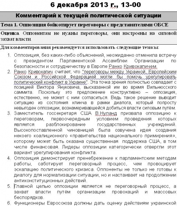 Зокрема, у них зазначається яку оцінку слід давати і як саме коментувати дії лідерів Майдану, лідерів опозиції, приїзд Міхаїла Саакашвілі та нещодавну інформацію про те, що Янукович пообіцяв Путіну "привести" Україну у Митний Союз.