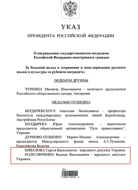 Президент Росії Володимир Путін нагородив медаллю Пушкіна Сергія Ківалова та Вадима Колесніченка.