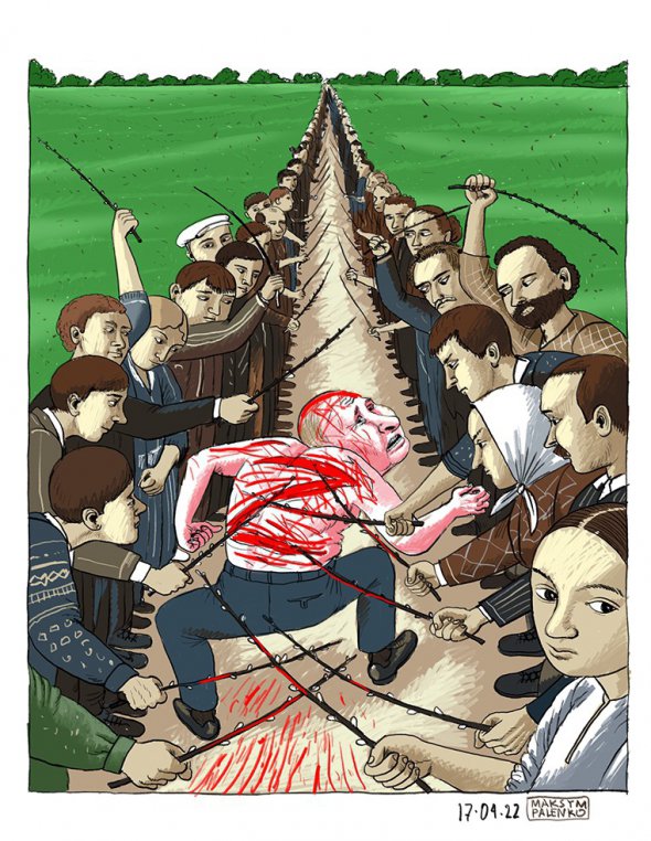 Також художник намалював Путіна, якого до крові б'ють вербою.