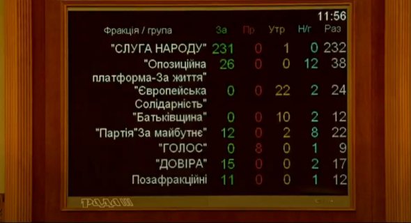 Зокрема "За" проголосували фракції "Слуга народу" і ОПЗЖ, групи "Партія "За майбутнє" та "Довіра".