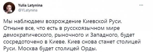 "Мы наблюдаем возрождение Киевской Руси. Отныне все, что есть в русскоязычном мире демократического, рыночного и Западного, будет сосредоточено в Киеве. Киев снова станет столицей Руси. Москва будет столицей Орды", - написала.