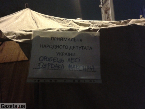 Також там розміщені намети з написом "Приймальня народного депутата України Лесі Оробець та Бурбака Максима".