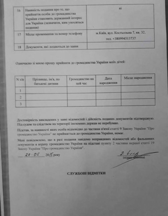 "Я в шоці! Щойно подивився копію анкети, яку опублікував з подачі Адміністрації президента один з лідерів його фракції (Володимир Ар'єв - ред). На підставі ось цього документу президент позбавив мене громадянства. Я з повною відповідальністю стверджую, що це - не мій підпис і не мною заповнена анкета", - заявив Саакашвілі.