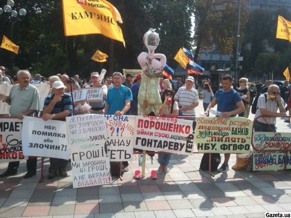 Поруч з ними стоять вкладники банку "Михайлівський". Ті принесли опудало голови Нацбанку Валерії Гонтаревої. Б'ють кришками від кастрюль, пластиковими пляшками та в барабан на залізній бочці. Вимагають, щоб на них звернули увагу нардепи. Тримають плакат: "Влада грабує "по-новому" дуже зухвало".