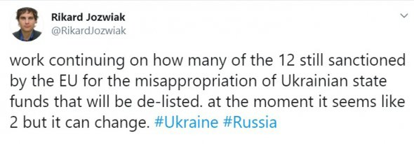 "Триває робота над тим, скільки з 12 осіб, які перебувають під санкціями ЄС за присвоєння українських державних коштів, виключать зі списку. На цей момент це 2 людини. Але це може змінитися", - написав журналіст.