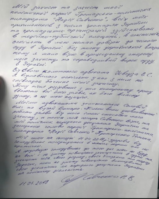 "Я продовжую голодування до того дня, поки не буду на волі і не зможу повноцінно захищатися в судах та захищати себе, свою родину, своїх близьких та народ України, поки не зможу повноцінно виконувати свою діяльність як народного депутата України та політичну діяльність", - написала Савченко.