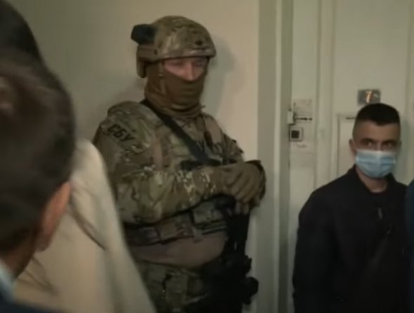 "Не получится. Только сюда. Эта квартира сдается, там проводится обыск без собственника. Там те, кто арендуют. Используют данное помещение в своих целях, незаконных", - відповідає той і показує на квартиру.