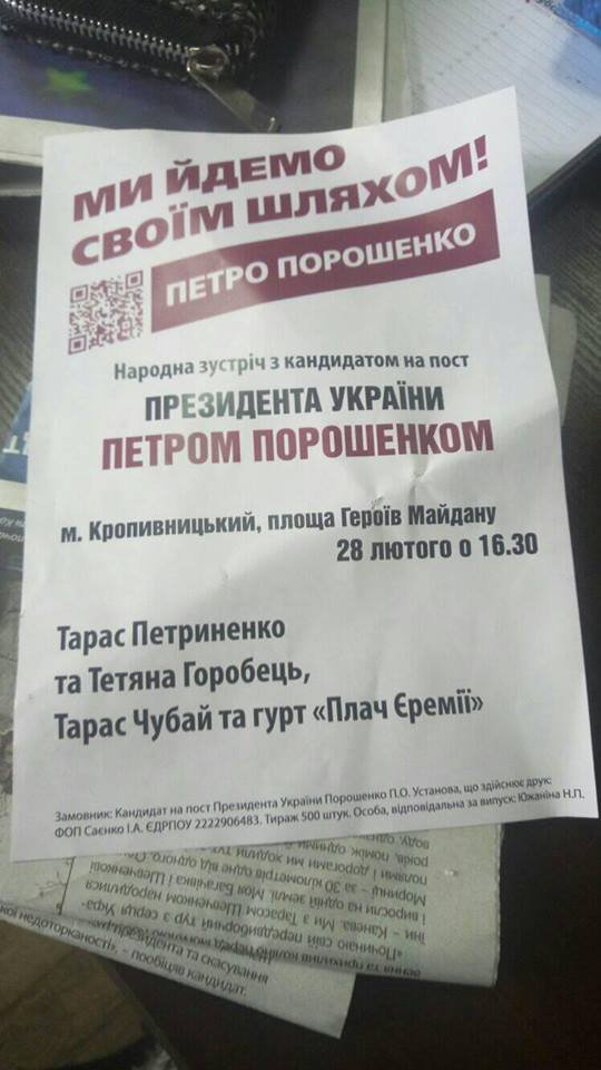 Співак та композитор Тарас Петриненко бере участь у агітаційному турі за кандидата у президенти Петра Порошенка. Відповідний анонс концерту з'явився у місті Кропивницькому.