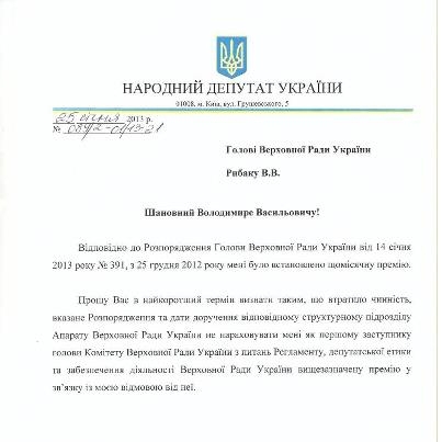 "Заява, яку я направив в п'ятницю Голові Верховної ради, щойно побачив розпорядження, яким мені, як першому заступнику голови Регламентного комітету, встановлена щомісячна премія у розмірі 86 % посадового окладу.