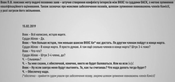 Вони обговорюють подачу позовів до Окружного адмінсуду для призупинення повноважень членів Вищої кваліфікаційної комісії суддів, пошук осіб, від імені яких будуть подаватися позови.