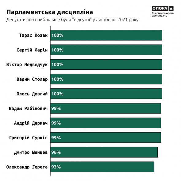 Четверо нардепів від ОПЗЖ пропустили 708 (100%) голосувань: Вадим Столар, Віктор Медведчук (перебуває під домашнім арештом), Тарас Козак і Сергій Ларін.