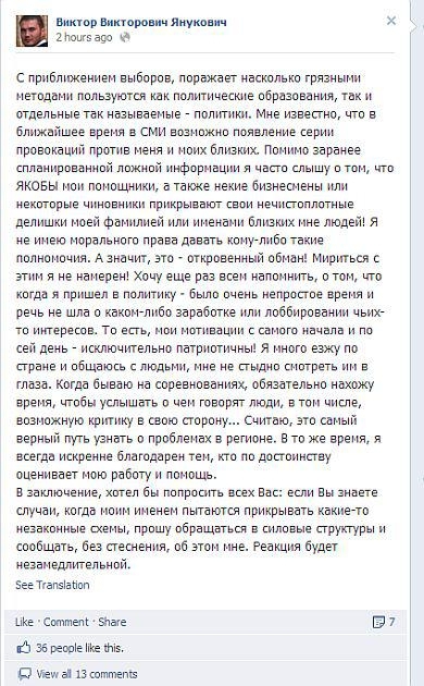 "Крім заздалегідь сплановано] неправдивої інформації я часто чую про те, що нібито мої помічники, а також якісь бізнесмени або деякі чиновники прикривають свої нечистоплотні оборудки моїм прізвищем або іменами близьких мені людей! - gояснив Янукович-молодший. Я не маю морального права давати аби-кому такі повноваження. А значить, це - відвертий обман! Миритися з цим я не маю наміру! Хочу ще раз всім нагадати про те, що коли я прийшов у політику - був дуже непростий час, і мова не йшла про якийсь заробіток або лобіюванні чиїхось інтересів. Тобто, мої мотивації з самого початку й донині - виключно патріотичні! Я багато їжджу по країні і спілкуюся з людьми, мені не соромно дивитися їм в очі. Коли буваю на змаганнях, обов'язково знаходжу час, щоб почути, про що говорять люди, в тому числі, можливу критику в свою сторону ... Вважаю, це найвірніший шлях дізнатися про проблеми в регіоні. В той же час, я завжди щиро вдячний тим, хто гідно оцінює мою роботу і допомогу".