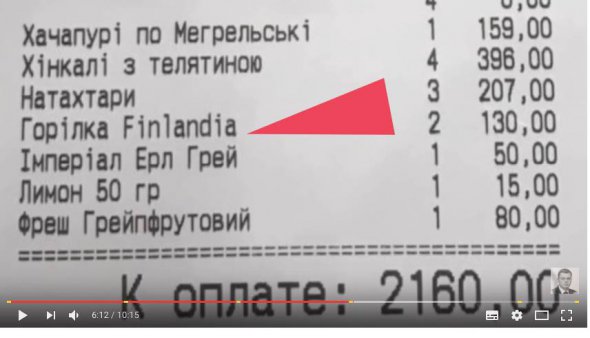 У замовленні вказані дві порції горілки Finlandia по 130 гривень. До неї політик замовив грузинські страви, чай і грейпфрутовий фреш.