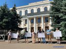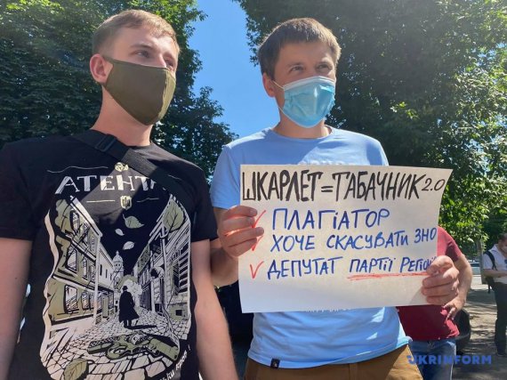 На акції зібралися близько 30 людей. Деякі активісти стоять з плакатами: "Шкарлет - кращий студент Табачника", "Ні деградації! Шкарлет - це зашквар", повідомляє Укрінформ.