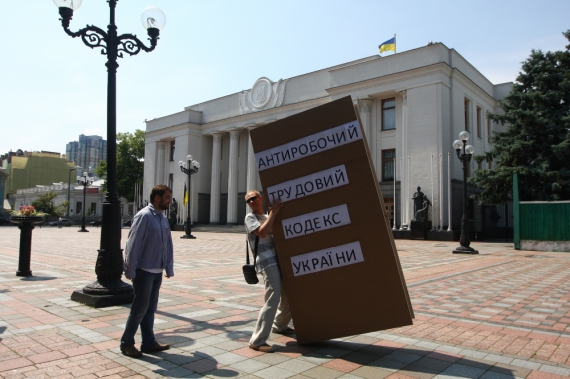 Ця книга символізує видання нового трудового кодексу, що придушує права робітників,- пояснює активіст об'єднання "Боротьба" Сергій Киричук. Він вдавав зварювальника. - Так показуємо, як будуть порушені права найманих робітників, якщо цей кодекс буде прийнятий. Він знімає обмеження 8-годинного робочого дня, знімає гарантовані відпустки, дозволяє обов'язковий відео-нагляд на робочому місці. Це роботодавець може використати, щоб маніпулювати працівниками.