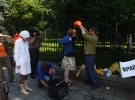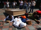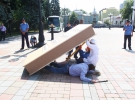 Акція триває 15 хв. Учасники збирають реманент. Тим часом за двадцять метрів від них активістка "Відсічі" Катерина Чепура сперечається із міліціонерами. Вона та ще троє людей намагаються пронести до будівлі Ради картонну коробку та муляж людського скелету.