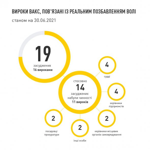 19 осіб засудили до ув'язнення 16 вироками у справах НАБУ й Спеціалізованої антикорупційної прокуратури. 14 вироків уже набули чинності.