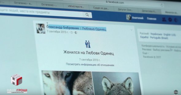Але в соціальній мережі Facebook, Бобровник на відміну від декларації вказав дружину - Любов Одинець, йдеться у розслідуванні Анатолія Остапенка "Теорія неймовірності" для програми "Наші гроші з Денисом Бігусом".
