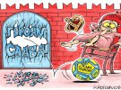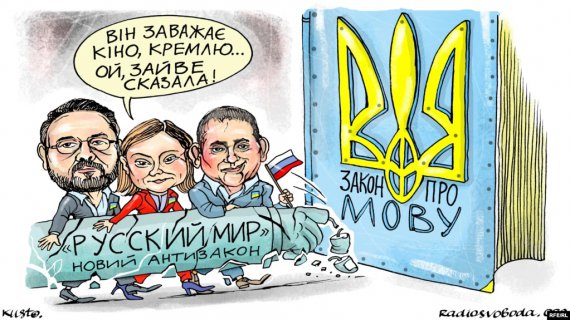 "Слуги народу" тримають "русский мир", який трощиться об закон про мову. Також тримають російський триколор. Зверху написана репліка: "Він заважає кіно, Кремлю...ой зайве сказала".