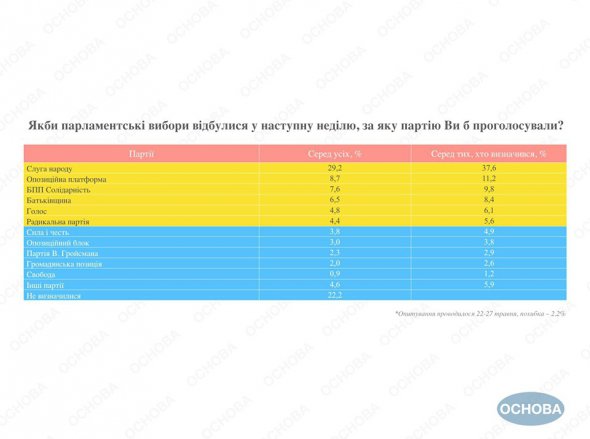 Згідно з результатами дослідження інституту "Основа", решта партій разом набирають 5,9%. 22,2% громадян не визначилися, за кого голосувати.