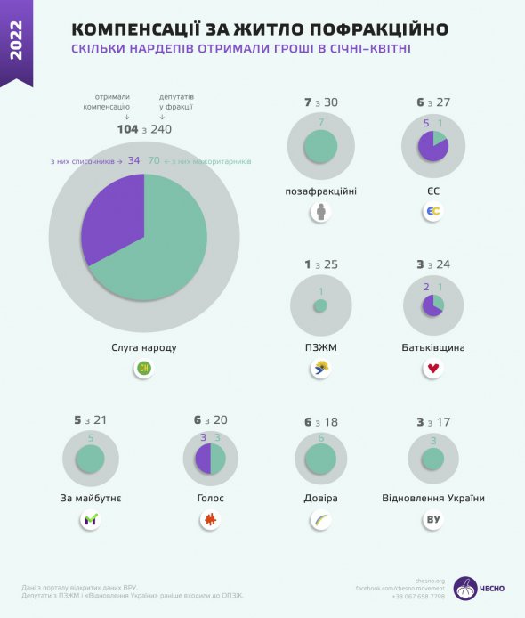 43 нардепи отримали компенсації за всі чотири перші місяці 2022-го - 34 нардепи зі "Слуги народу"; по одному з фракції "Батьківщина", "Голос", групи "Партія "За майбутнє" і позафракційний; двоє з групи "Довіра"; троє з "Європейської солідарності".