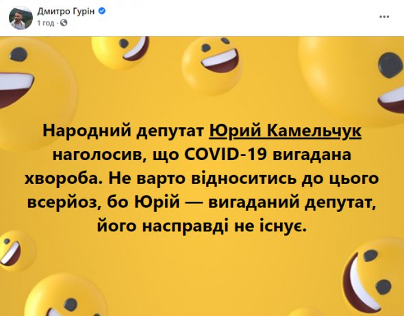 "Народний депутат Юрий Камельчук наголосив, що Covid-19 - вигадана хвороба. Не варто ставитися до цього серйозно, бо Юрій — вигаданий депутат, його насправді не існує", - написав колега Камельчука по фракції.