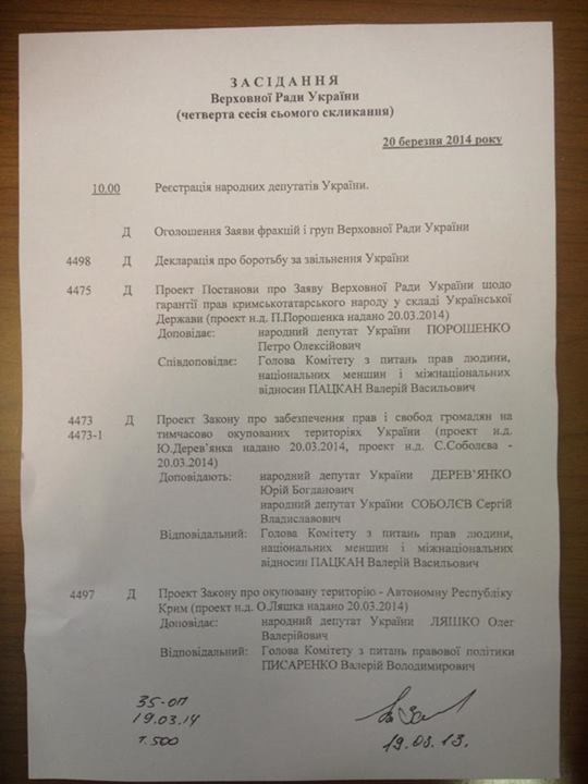 Також у порядку денному законопроект "Про забезпечення прав і свобод громадян на тимчасово окупованих територіях України" та проект закону "Про окуповану територію Автономну Республіку Крим".