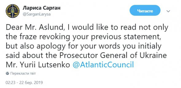 "Шановний пане Аслунд, я б хотіла прочитати не тільки фразу про скасування вашої попередньої заяви, але й вибачення за ваші слова, які ви спочатку сказали про генерального прокурора України Юрія Луценка", - написала Сарган.