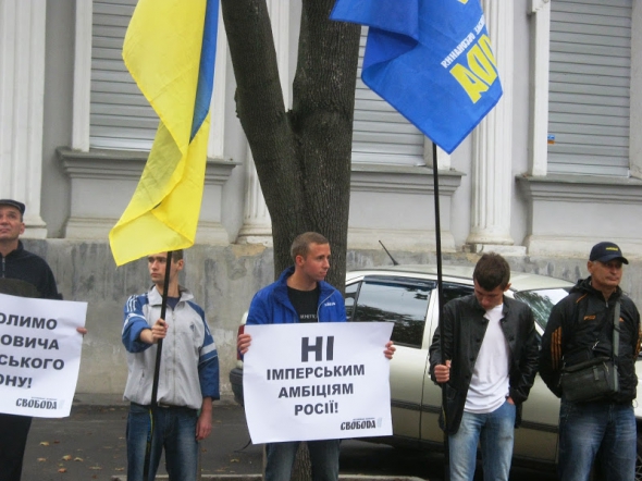 Учасники пікету розгорнули перед консульством плакати із написами: "Вимагаємо повернути Федоровича в Україну!", "Російських вбивць – за грати!", "Обережно! Митний союз!" і скандуваннями нагадували дипломатам, на чиїй землі вони перебувають: "Слава Україні! – Героям слава!", "Пам'ятай чужинець: тут господар – українець!".