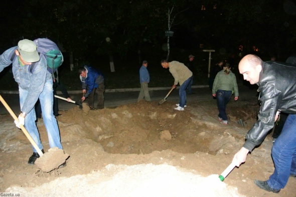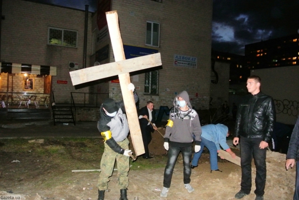 Вони скинули будівельні вагончики до котловану, а фундамент облили автомобільним маслом. Крім того, неподалік від місця забудови активісти встановили хрест, як символ того, що незабаром "буде похоронено всі несправедливості по відношенню до українців".