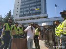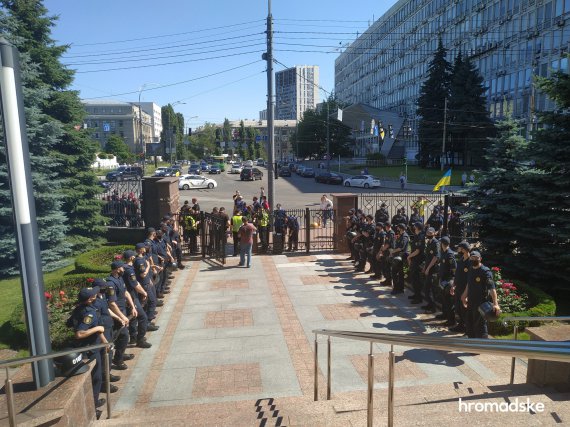 Біля входу до суду стоять шеренги поліції. Правоохоронці перевіряють речі.