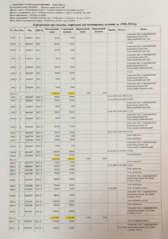 Зокрема, згідно з інформацією про доходи, отриманою від податкових агентів, у 1998-2016 роках Лещенко отримав 1 779 177 грн. Притула за той період отримала 4 757 439 грн доходу. Дохід Топольської за 2005-2016 роки становив 254 405 грн.